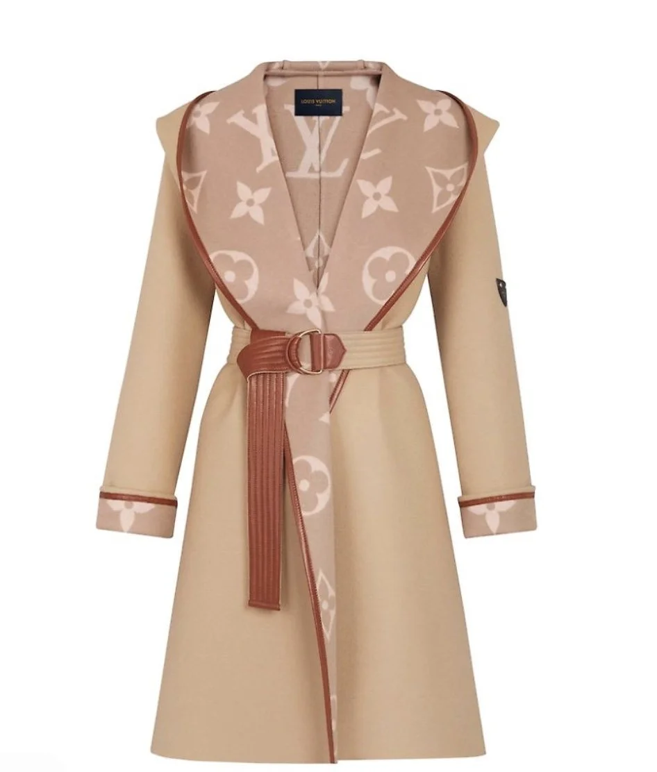 This hooded wrap coat is made from double-face wool-silk. Warm and comfortable, it’s a Louis Vuitton classic. A large Monogram lines the inside, and a seasonal belt cinches the waist for a feminine shape.